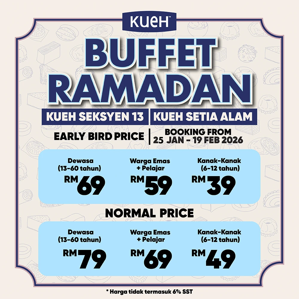 Pilihan makanan panas dan hampir 40 jenis kuih-muih tradisional & moden disediakan segar setiap hari — sesuai untuk tapow berbuka puasa bersama keluarga.