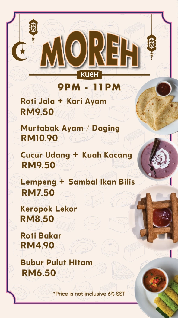 Bermula Isnin, 23/2/2026, Moreh Kueh beroperasi setiap hari dari 9PM – 11PM di semua outlet kami.