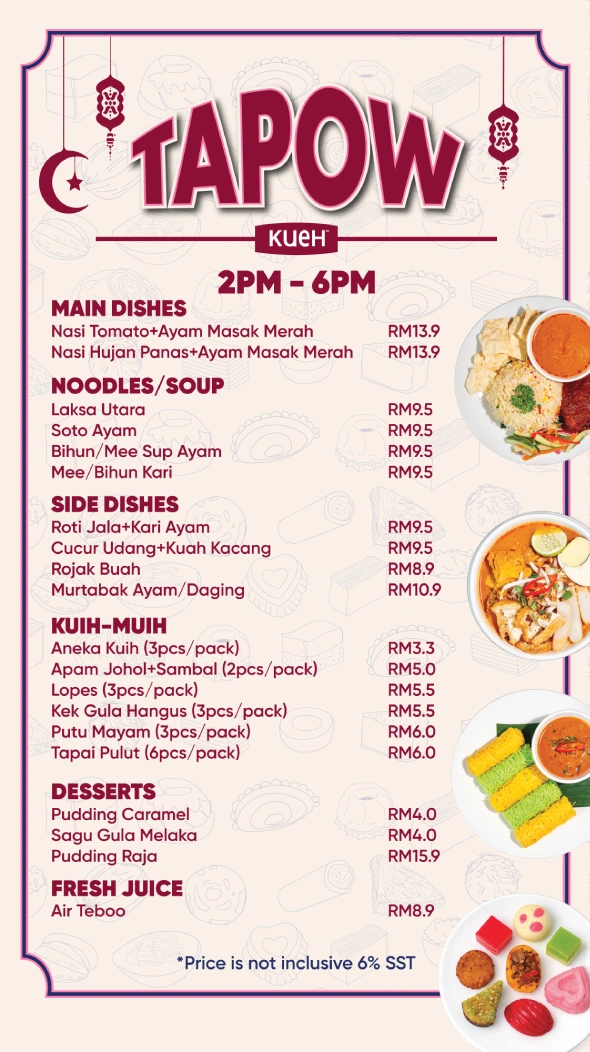 Bermula Isnin, 23/2/2026, Tapow Kueh beroperasi setiap hari dari 2PM – 6PM di hadapan outlet kami di Shah Alam, Subang Jaya, Setia Alam, Petaling Jaya & Bukit Jelutong.
